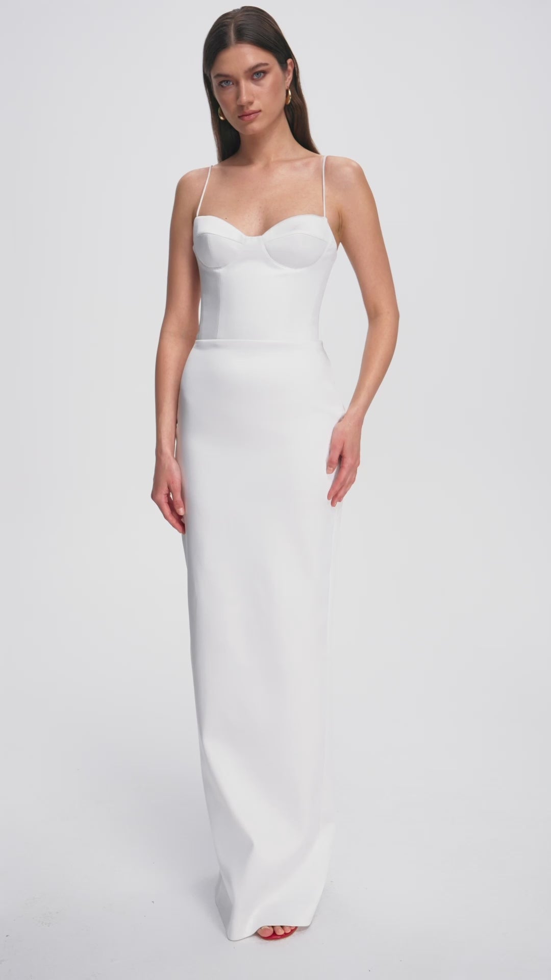 • A classic model of a floor-length combination dress. Naturally hugs the figure, stretching it and emphasizing the natural lines of the body. Thin straps accentuate shoulders and neck line. Stiff cups comfortably support the chest, and the soft corset gently highlights the waist.